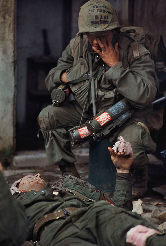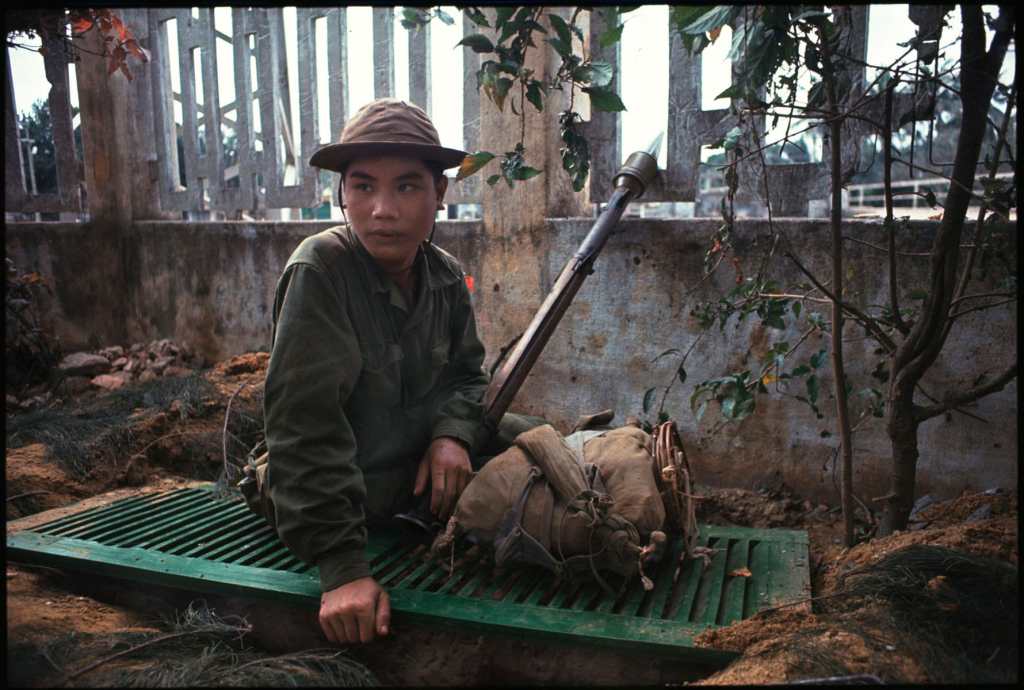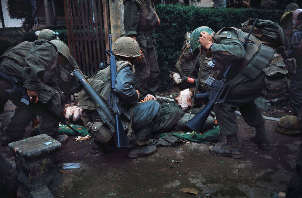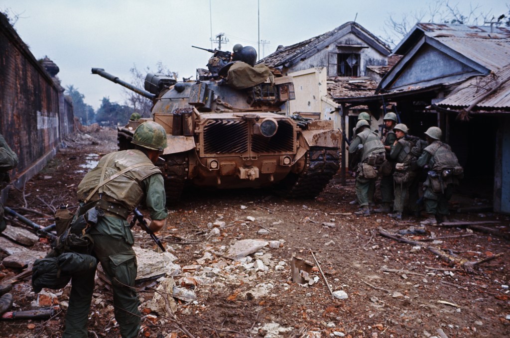 American forces had learned a lot about urban combat during WWII; but much of that institutional knowledge had been forgotten in the jungles of Vietnam, and Marine officers had to break out manuals on close quarters combat to refresh themselves. Fighting in Huế required overwhelming firepower. Marines would blast holes into adjoining rooms to avoid moving in the streets, and made liberal use of grenades to clear rooms before they entered them. Young Marines were instructed to enter every room “M16 first”, firing on fully automatic whether an enemy was spotted or not. They found that the VC and PAVN would fight to the very end and make creative use of hiding spots to ambush the Marine advance. Through the weeks of intense fighting, soldiers and civilians alike – for there were many of Huế’s residents trapped between the opponents – became numbed to the constant pounding of explosives and learned to instinctively duck at the crack of incoming gunfire.